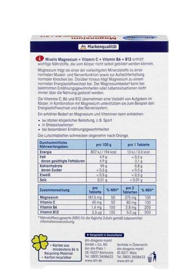 ویژگی های قرص مکیدنی منیزیم و ویتامین C میولیس بهبود عملکرد سیستم عصبی به همراه ویتامین های B6 و B12 با طعم پرتقال کمک به افزایش سلامت و تراکم استخوان ها تقویت ماهیچه ها و عضلات تولید انرژی جلوگیری و رفع گرفتگی های عضلانی افزایش کیفیت خواب و درمان اختلالات روحی محصول کشور آلمان روش مصرف روزانه یک الی دو عدد قرص جویدنی منیزیم میولیس را به آرامی بجوید یا مکیده شود.